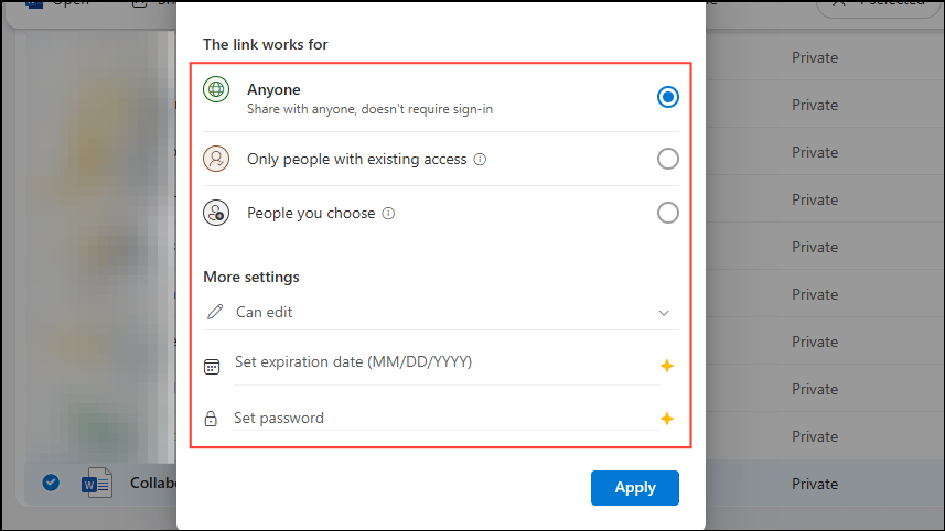 - You can then choose the people who can use the link and whether they can only view the file or edit it as well using the provided options.