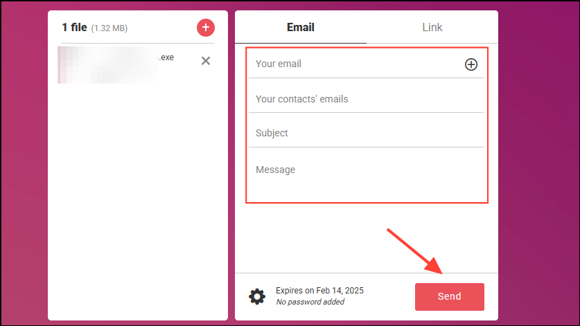 - Once you upload your file or folder, enter your email address, the email address of the recipient, the subject of the message, and the message itself in the provided fields. Then click the 'Send' button to send a link to the file via email to the person you want to share the file with.