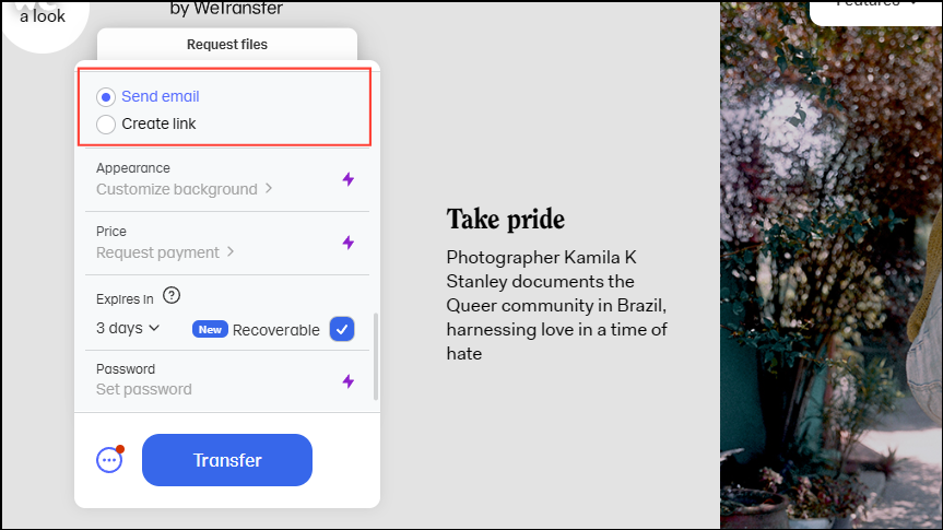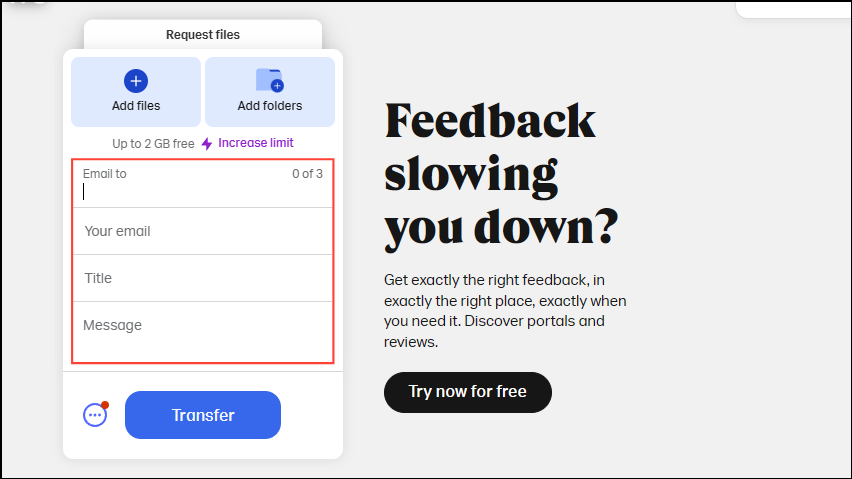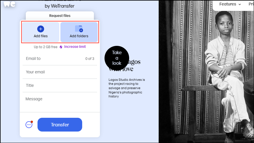 WeTransfer is an online platform that lets you share files up to 2GB for free. And if you want to send files up to 3 GB per month, all you need to do is sign up on the platform for free. Simply upload your files to the WeTransfer website and you will get download links to the files which you can then share with others.
