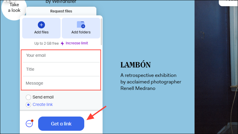 - If you select the 'Create link' option, enter your email address, a title name for the file, and your message in the respective fields before clicking on the 'Get a link' button.