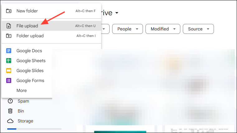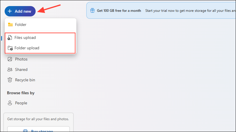 - Click on the 'Add new' button on the left and select 'Upload files' or 'Upload folders' as per your needs.