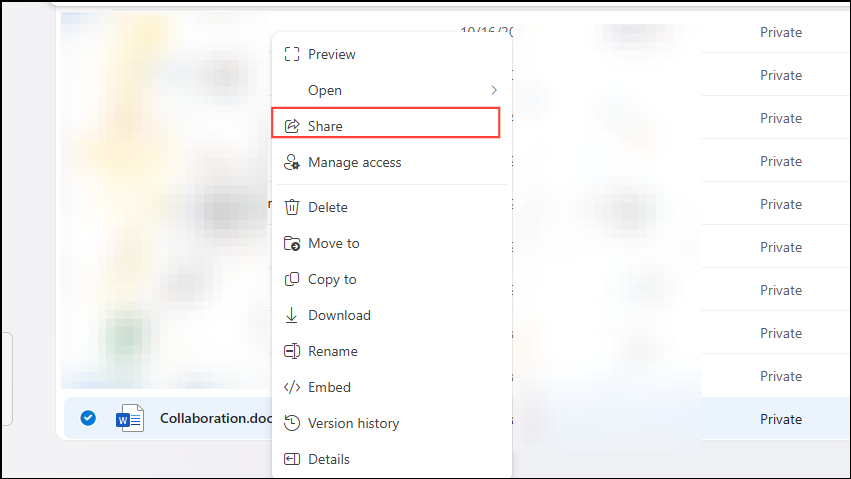 - After uploading your file or folder, right-click on it and click on 'Share'.