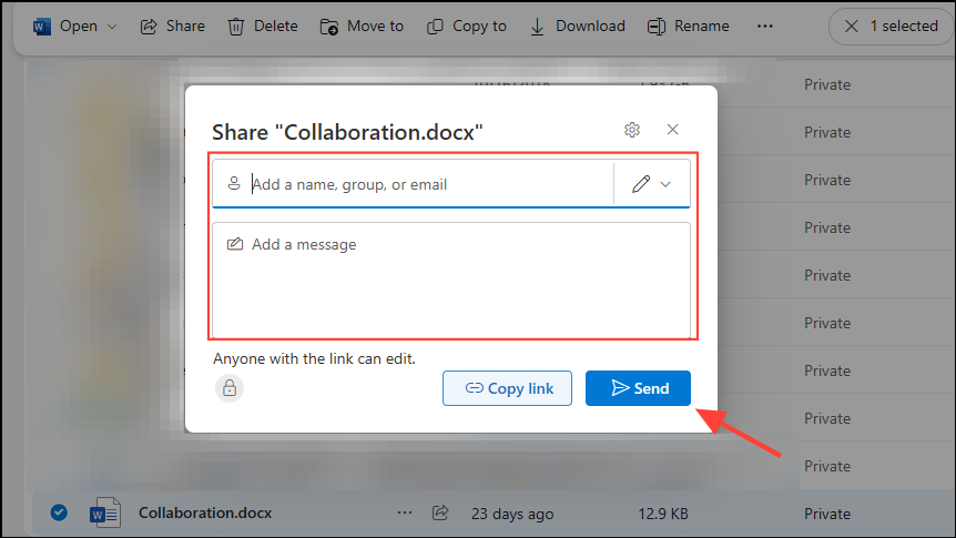 - Enter the name or email address of the person or group you want to share the file with in the provided field. You can also type in a message before clicking the 'Send' button.