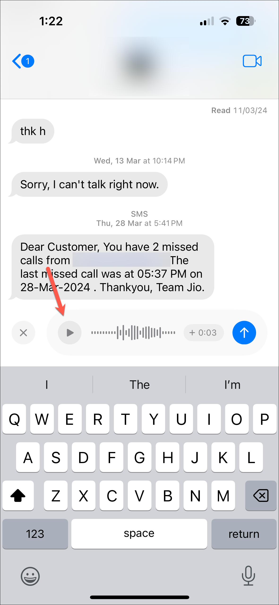 Step 6: After stopping, the audio message appears in the message box. You can listen to it by tapping the 'Play' button.