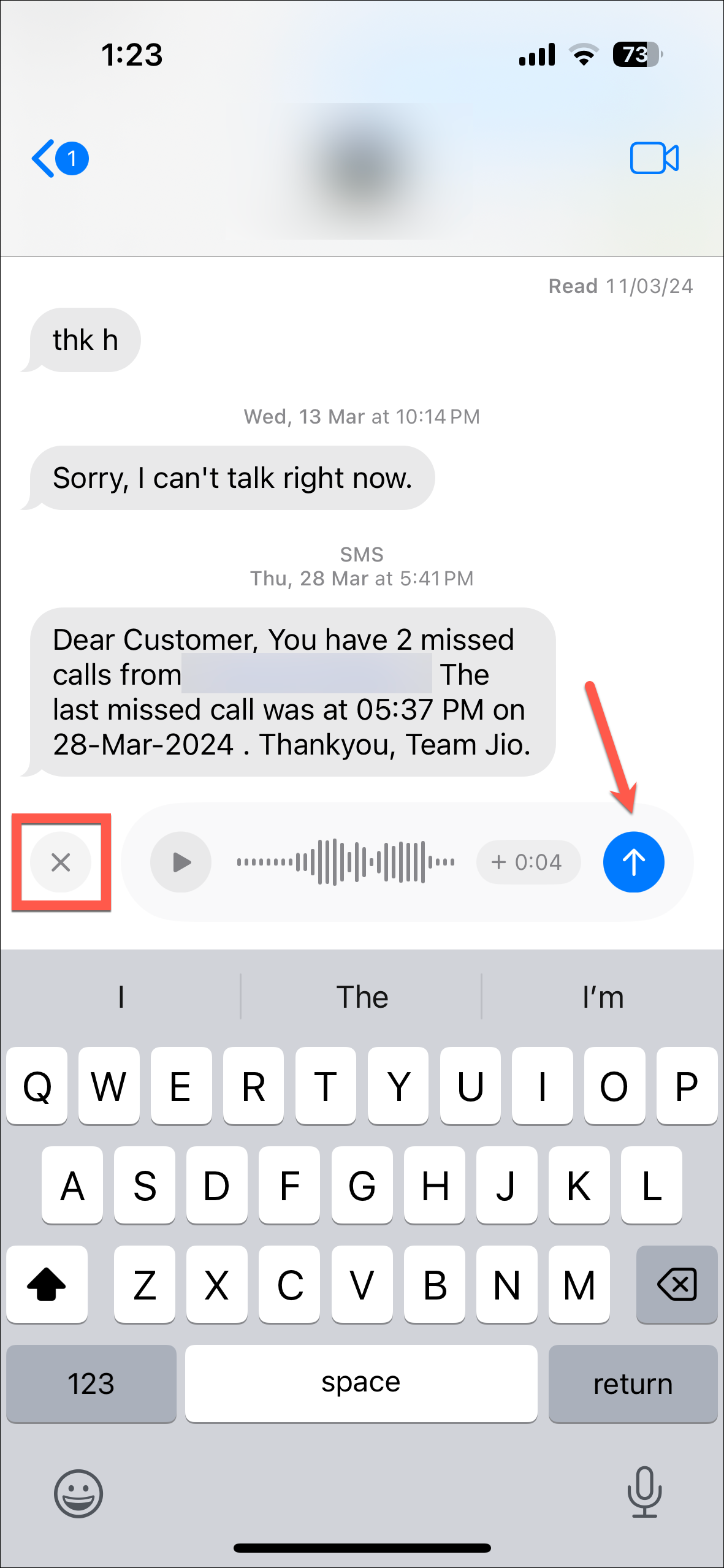 Step 8: Once you are satisfied with the recording, tap the 'Send' button (the blue arrow) to send the voice message. If you want to discard it, tap the 'X' button to the left of the message field.