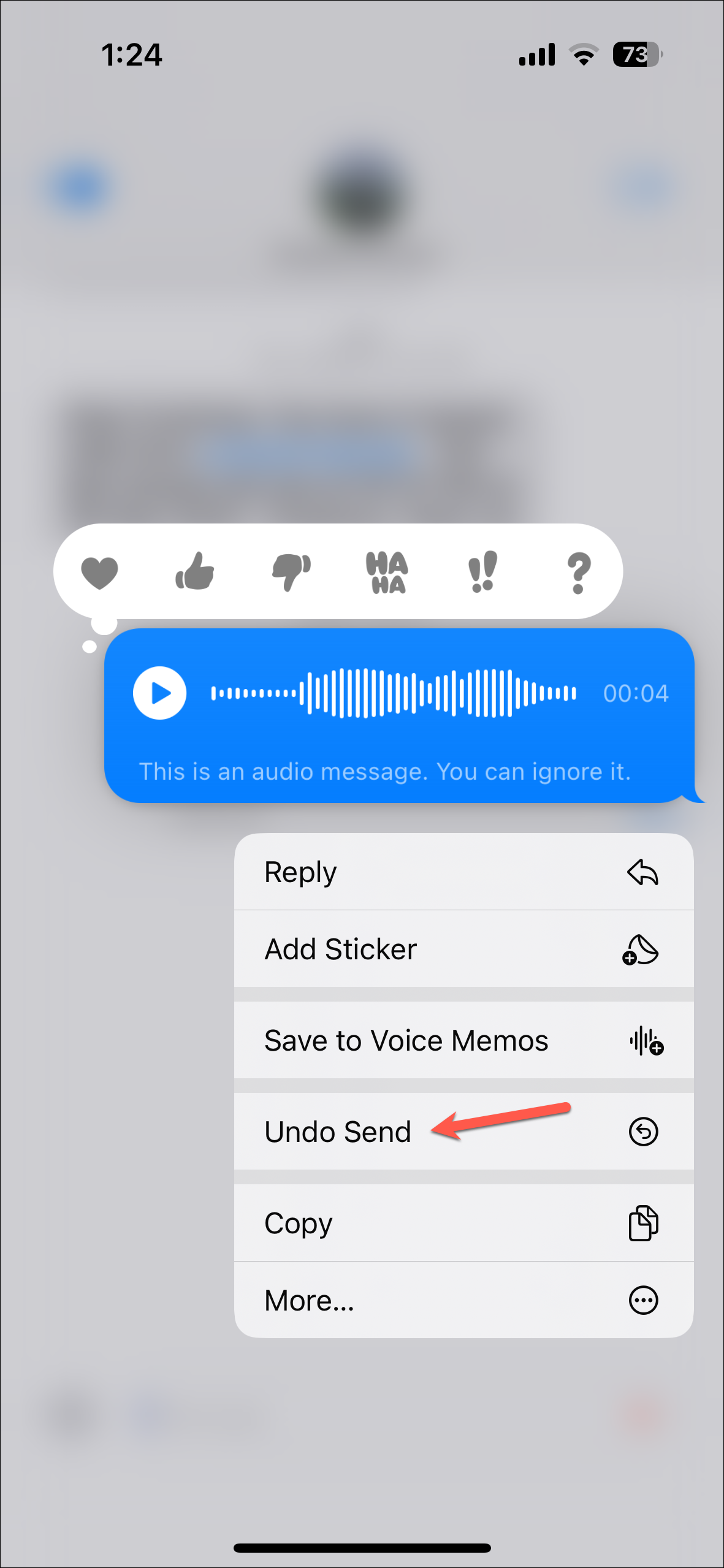 Step 13: If you change your mind after sending a voice message, you can use the 'Undo Send' option. Simply press and hold the sent message and select 'Undo Send'. Additionally, you can save both sent and received audio messages to the Voice Memos app on your iPhone.