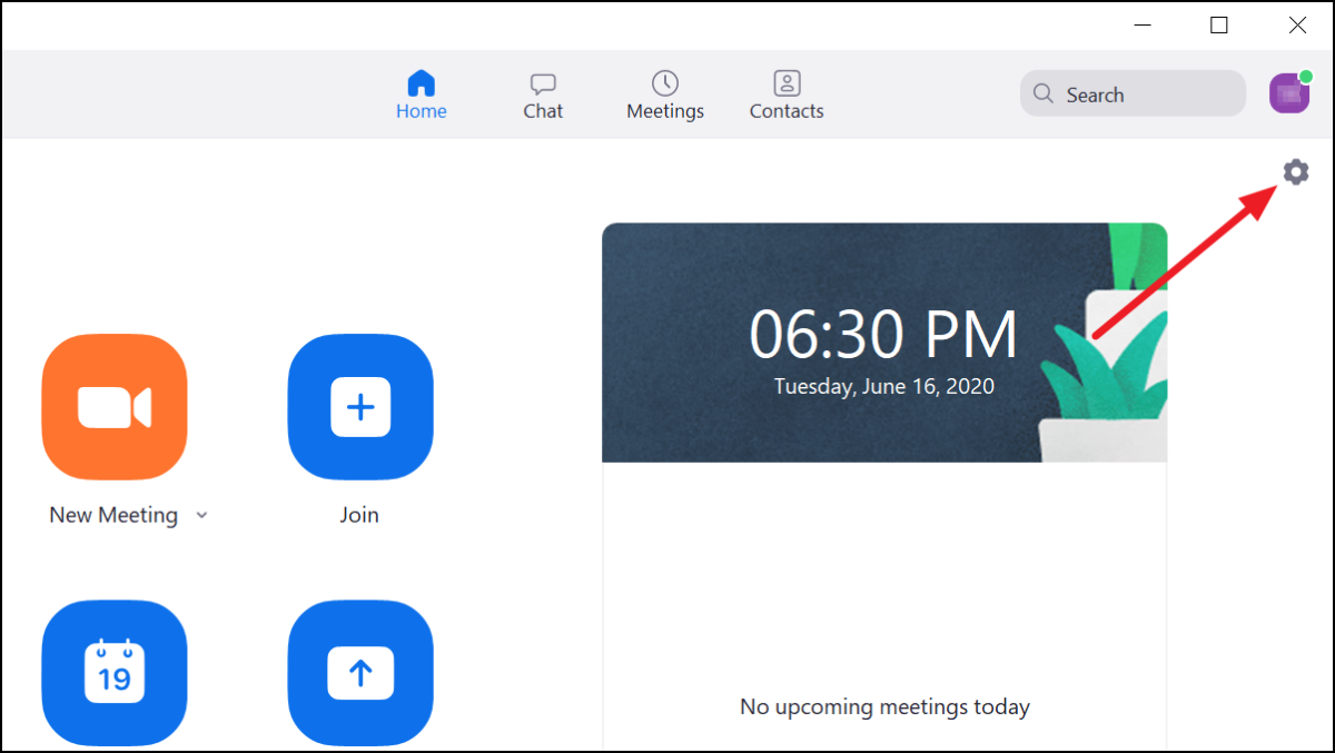Open the Zoom app and sign in to your account. Click on the ‘Settings’ gear icon on the top right corner.