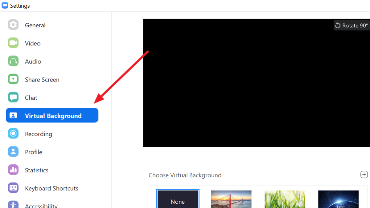 In the ‘Settings’ window, click on the ‘Virtual Background’ tab on the left side of the window.