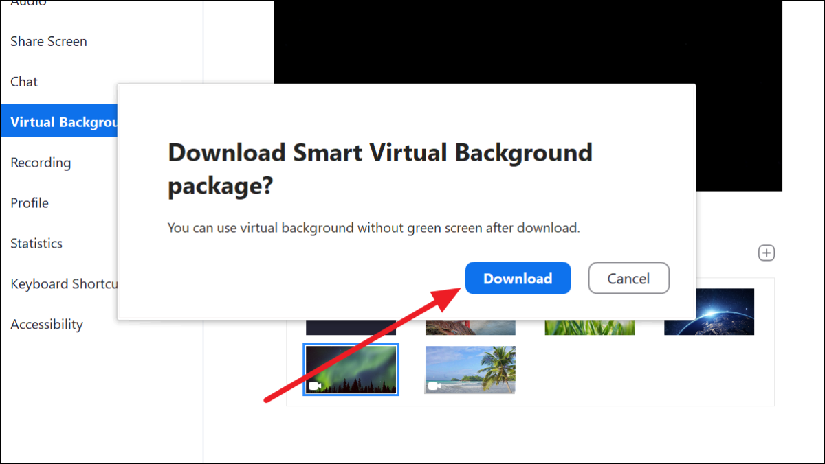 Note: The first time you select a video/photo background, you will be prompted to download the ‘Smart Virtual Background Package’. Click on the ‘Download’ button in the dialog box.