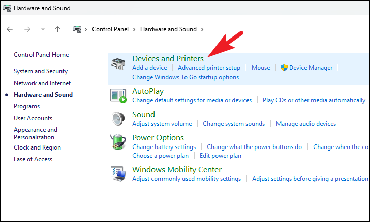 Step 4: Under the 'Devices and Printers' section, select Devices and Printers.