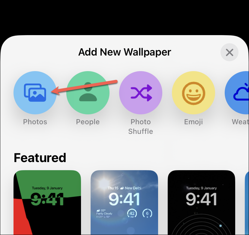 To select a photo from your gallery, tap the option for ‘Photos’ from the wallpaper gallery.