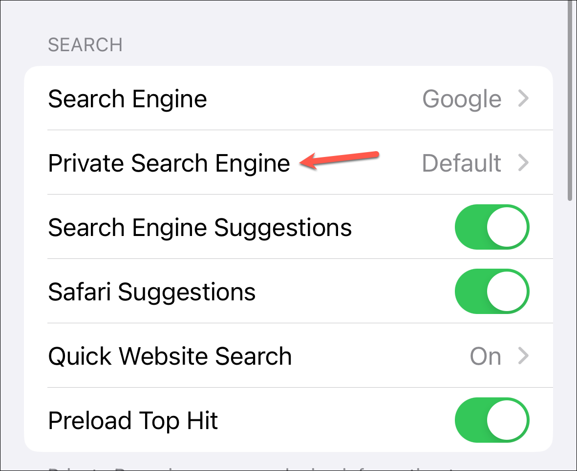 Step 4: Next to Private Browsing search engine, click on the current selection, which is likely set to Default.