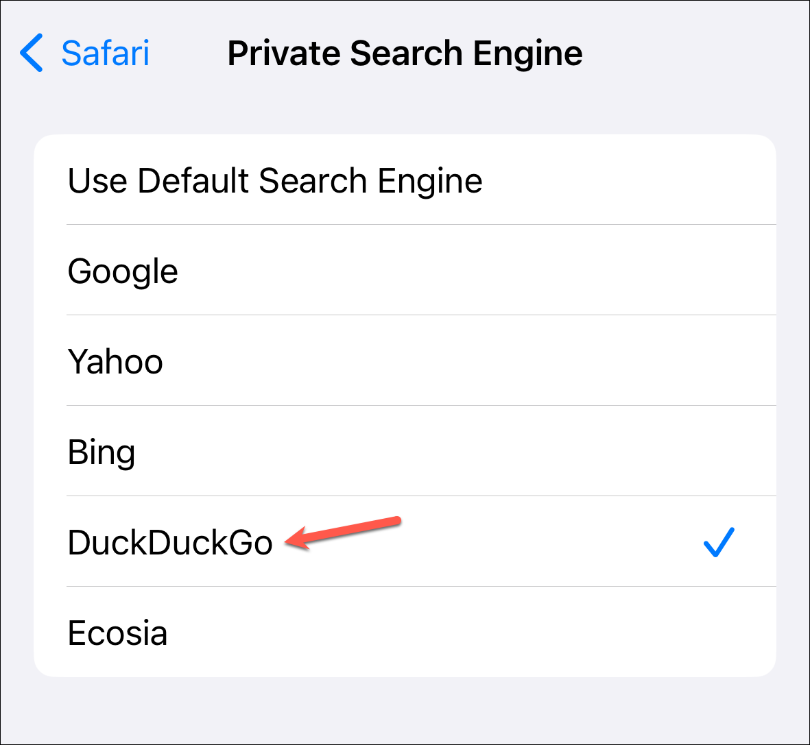 Step 4: By default, Safari uses the same search engine for both normal and private browsing. To change this, select your preferred search engine for private mode from the list of options: Google, Yahoo, Bing, DuckDuckGo, or Ecosia. Simply tap on your choice to select it.
