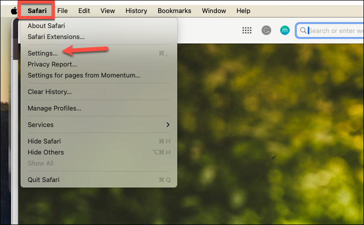 Step 2: Click on Safari in the menu bar at the top-left corner of the screen, then select Settings from the dropdown menu.