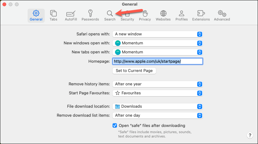 Step 3: In the settings window that appears, click on the Search tab to view search-related options.