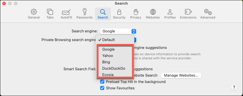 Step 5: From the dropdown menu, choose your preferred search engine for private browsing. Options include Google, Yahoo, Bing, DuckDuckGo, and Ecosia.