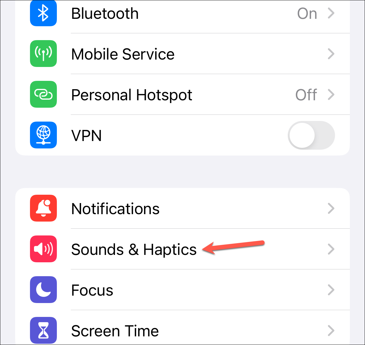Then, tap the option for 'Sounds and Haptics'.