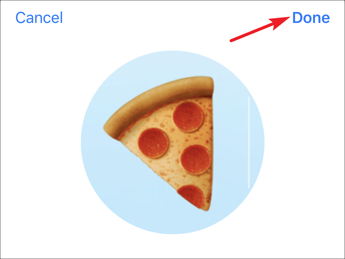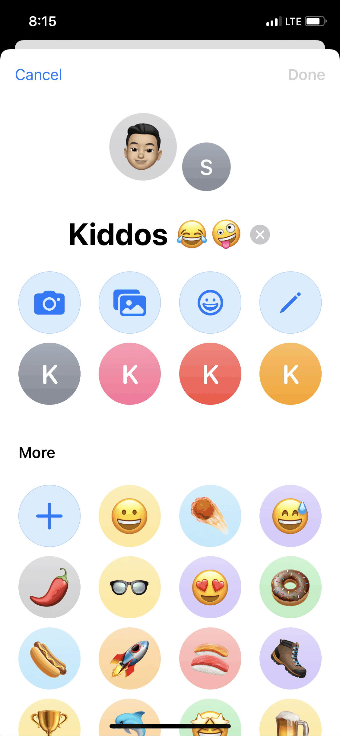 The editing screen will open. You can set a photo from your gallery, take a new photo, set text, or use an emoji or animoji as the group icon. It will show some emojis and your recently used animojis as suggestions but you can add more.