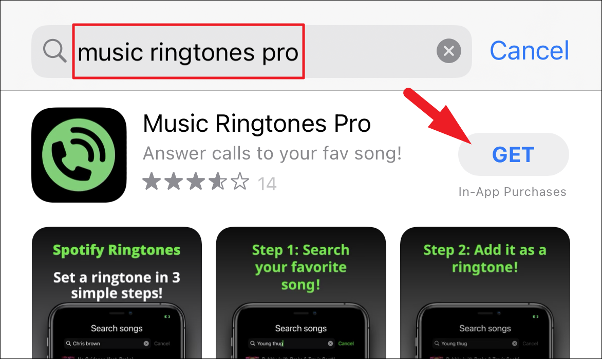 Then, type Music Ringtones Pro in the search bar and tap on the ‘Search’ button present at the bottom right corner of the keyboard on your screen. After that, from the search results, click on the ‘Get’ button present on the right edge of the ‘Music Ringtones Pro’ tile and then provide authentication for Apple ID by your preferred method to download the app.