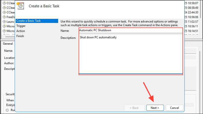 - Now, give the task a name, such as 'Automatic PC Shutdown', and a description for the task before clicking on the 'Next' button.