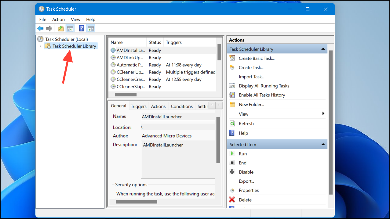 - Open the Task Scheduler and click on 'Task Scheduler Library' on the left.