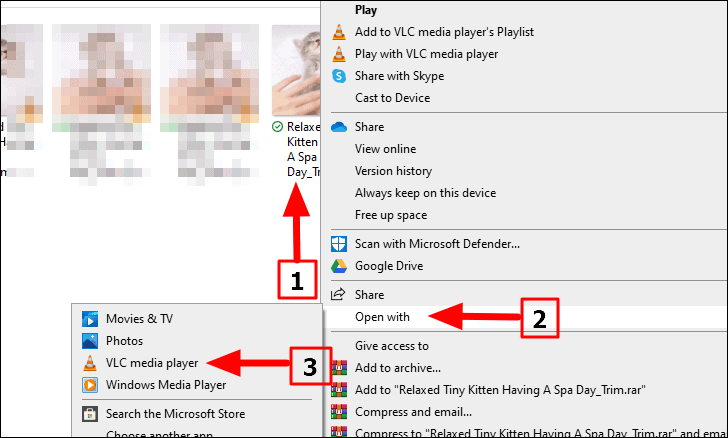 After the app is installed, locate the video that you want to set as wallpaper, right-click on it, hover the cursor over ‘Open with’, and then select ‘VLC media player’ from the menu. This is only to be done if VLC media player is not set to default, in case it’s, you can simply double-click on the video to play it.