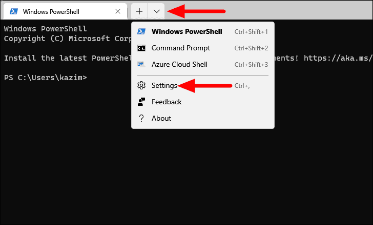 In Windows Terminal, click on the downward-facing arrow at the top and select ‘Settings’ from the list of options. Alternatively, you can press CTRL + , to launch the Terminal Settings.