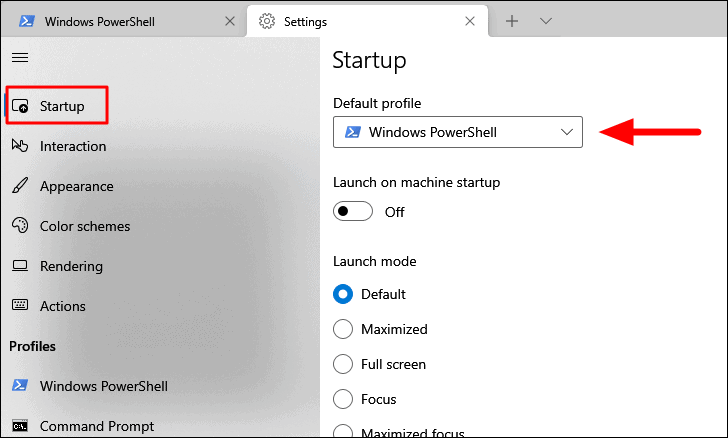In Terminal Settings, the ‘Startup’ tab will launch by default. Next, click on the ‘Default profile’ drop-down menu on the right.
