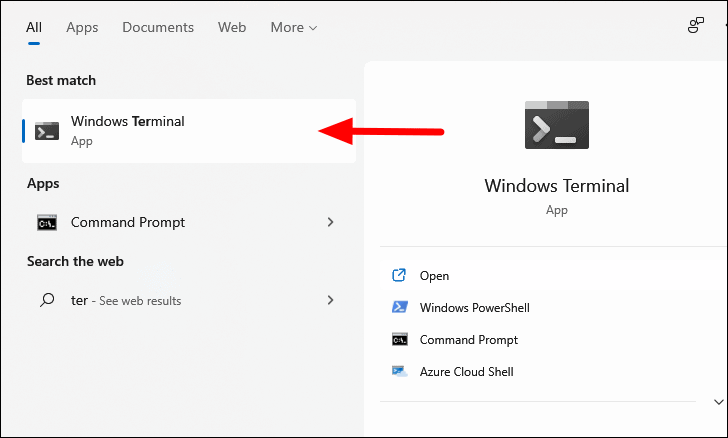 To change the default profile to Command Prompt in Windows Terminal, press WINDOWS+S to launch the ‘Search’ menu. Type ‘Windows Terminal’ in the text field, and click on the relevant search result to launch the app.
