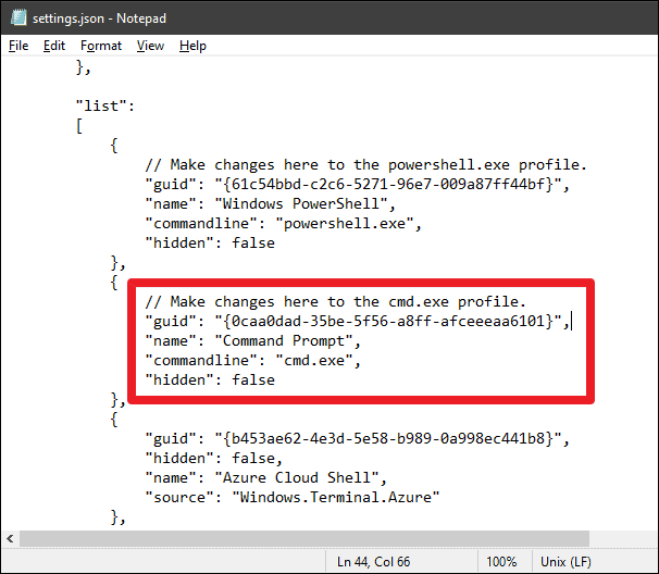 Step 9: Note the "guid" value associated with the Command Prompt profile. Make sure this GUID matches the one you've placed in the "defaultProfile" setting. If it doesn't, copy the correct GUID from the Command Prompt profile and replace it in the "defaultProfile" line.