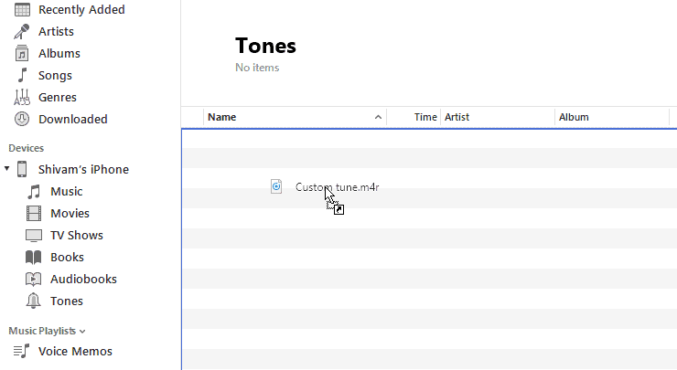 - Now drag and drop the .m4r file that we downloaded in step 3 above inside the Tones section (with empty lines) on iTunes.