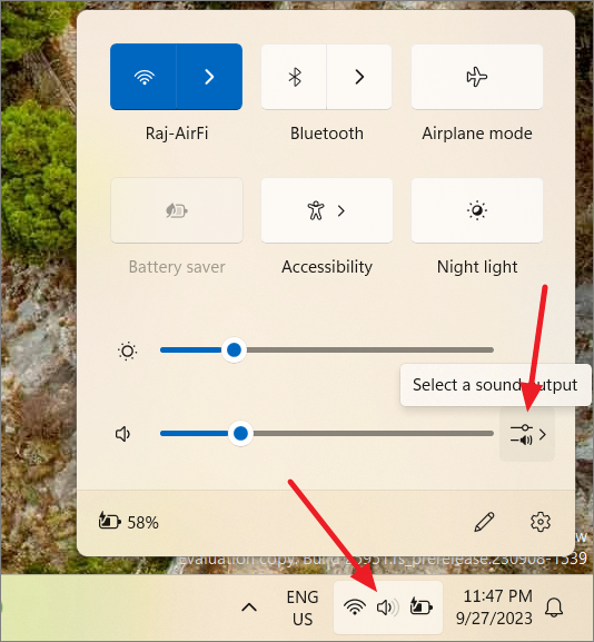 Step 1: Click on the Volume icon located in the taskbar corner. Then, click the Select a sound output button (represented by a sideways arrow) next to the volume slider. Alternatively, you can press the Windows + Ctrl + V keys simultaneously to open the Volume Mixer directly.