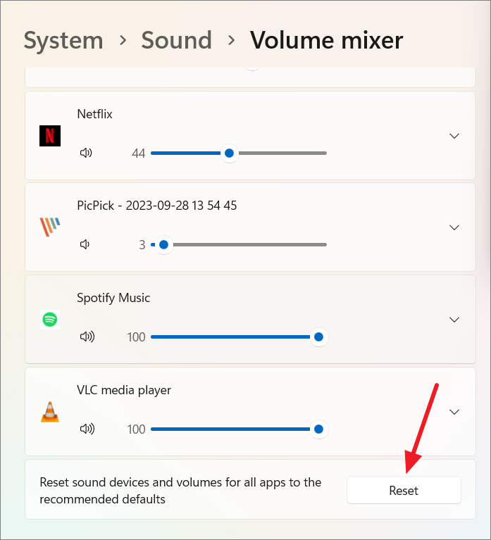 Step 4: If you need to reset all sound settings to their default values, click the Reset button at the bottom of the Volume mixer screen. This will return all app volumes to 100% and revert any device selections to their defaults.