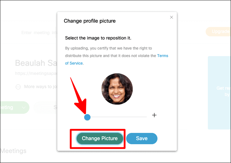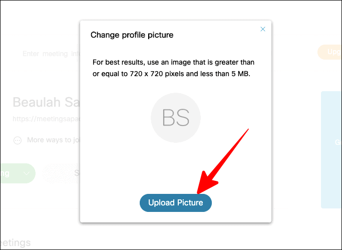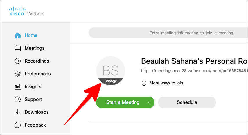 Beside your name on the home of Webex portal, you’ll find your profile picture or initials of your full name. Hover your mouse cursor over the image profile picture area and click on ‘Change’ that appears in the lower half of the circle.