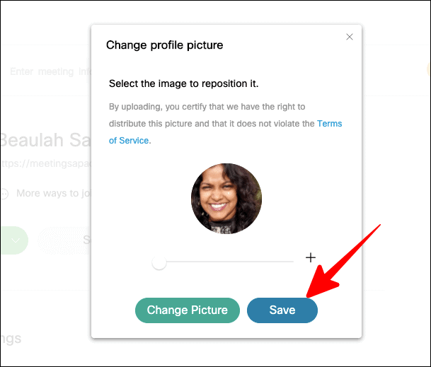 Once you’re satisfied with the image you’ve chosen and the adjustments you’ve made, click on the ‘Save’ button and your image will be updated for your Webex profile.
