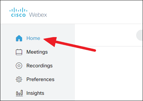Go to signin.webex.com and login with your account. The first page that should load after you sign-in is the ‘Home’ of the Webex web portal. If you’re redirected anywhere else, click ‘Home’ on the panel on the left.