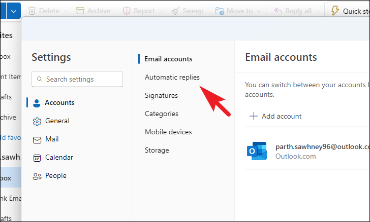 Step 3: In the Settings panel, select the 'Accounts' tab from the left sidebar, then click on 'Automatic replies' to proceed.
