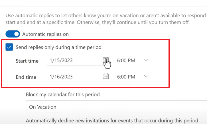 Step 5: If you want the automatic replies to be sent only during a specific time frame, check the box labeled 'Send replies only during a time period'. Then, set the start and end dates and times.