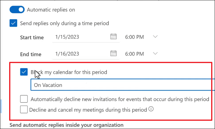 Step 6: To block your calendar, decline new meeting requests, and cancel existing meetings during your absence, check the options 'Block my calendar for this period', 'Automatically decline new invitations for events that occur during this period', and 'Cancel meetings during this period'. This will inform your colleagues about your unavailability.