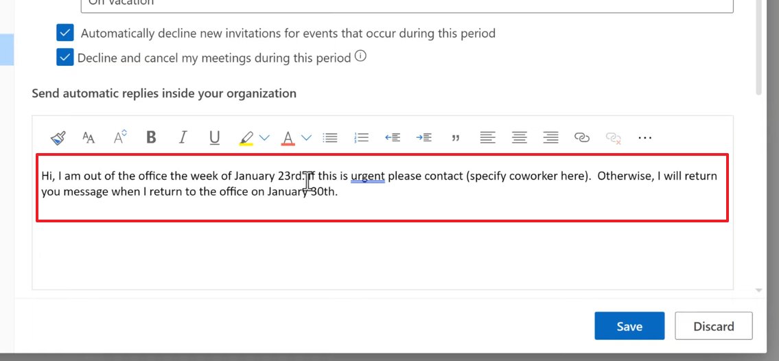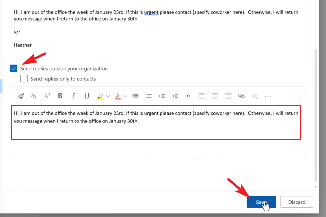 Once saved, Outlook will automatically send your specified reply to anyone who emails you during the time period you set.