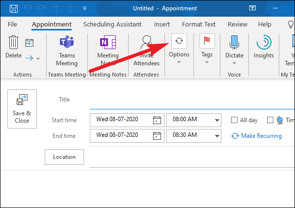 The dialog box for creating an appointment will open. Create an appointment for when you will be out of the office. Now, click on ‘Options’.