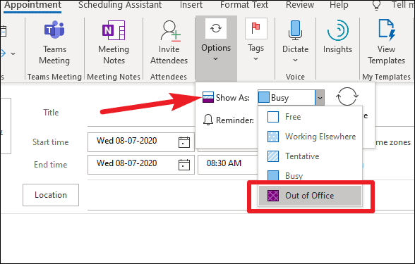 From the drop-down next to ‘Show as’, select ‘Out of Office’ and save the appointment.
