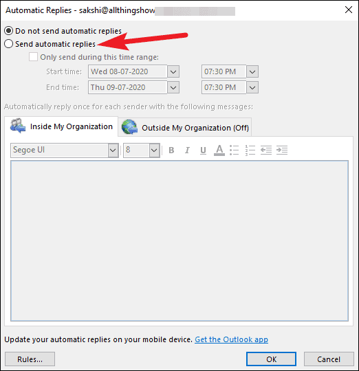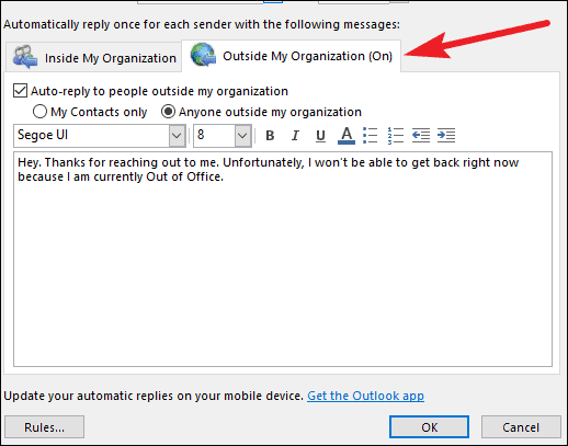 You can set a custom message for what to reply with to messages received. Now, if you are using an organization account, there will be two options for the message. You can set different messages for people internal and external to your organization. For a personal account, there won’t be a distinction. Finally, click on ‘OK’ to save the changes.