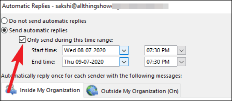 You can also specify a time range during which to send the out of office message. Check the box for ‘Only send during this time range’ and select the date and time.