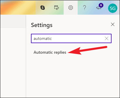 In the search text box, type ‘Out of office’ or ‘Automatic Replies’ and then click on the search result for Automatic Replies setting.