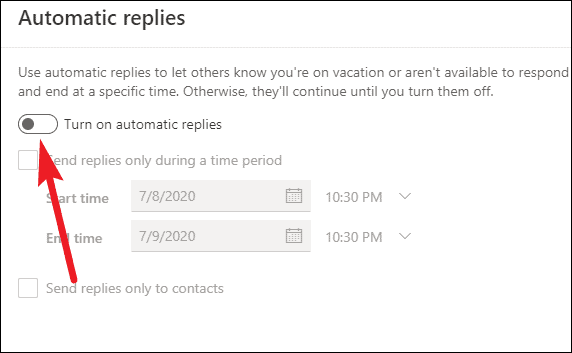 The dialog box for automatic replies will open. Turn on the toggle for ‘Automatic Replies On’.
