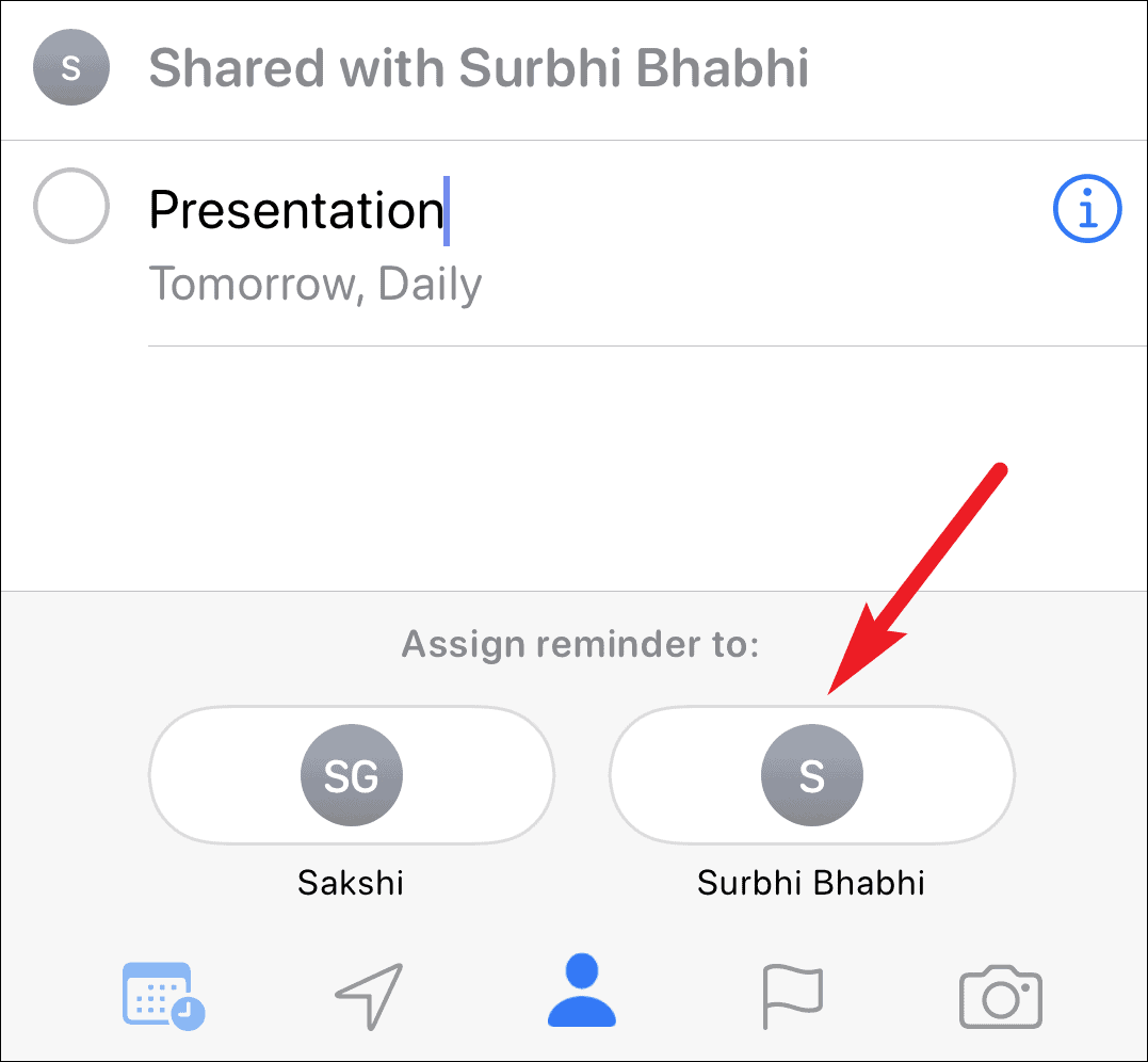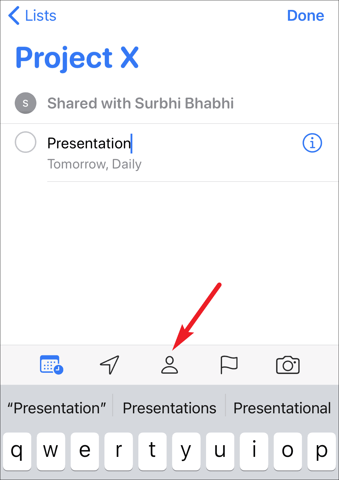 To assign a task to someone quickly, tap on it. A toolbar will appear on the top of the keyboard, tap on the ‘People’ icon on it.