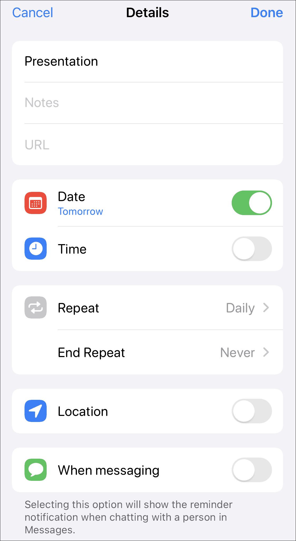 Then select when you want the notification for the reminder to appear from the ‘Details’ screen.