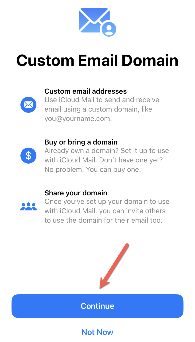 An onboarding screen will appear if this is the first time you’re using the Custom Email Address feature. Tap the ‘Continue’ button.