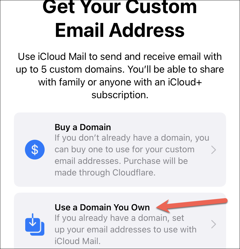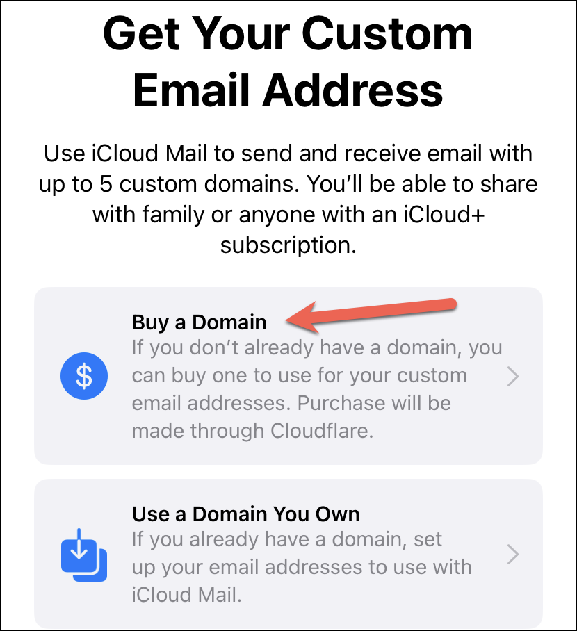 Note: The option to buy a domain using iCloud is only available in iOS 16 and above.